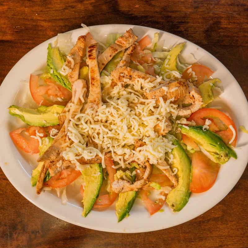 Grilled chicken breast, topped with chipotle or poblano sauce or zarandeado, and melted cheese. Served with rice, beans, salad, and guacamole.