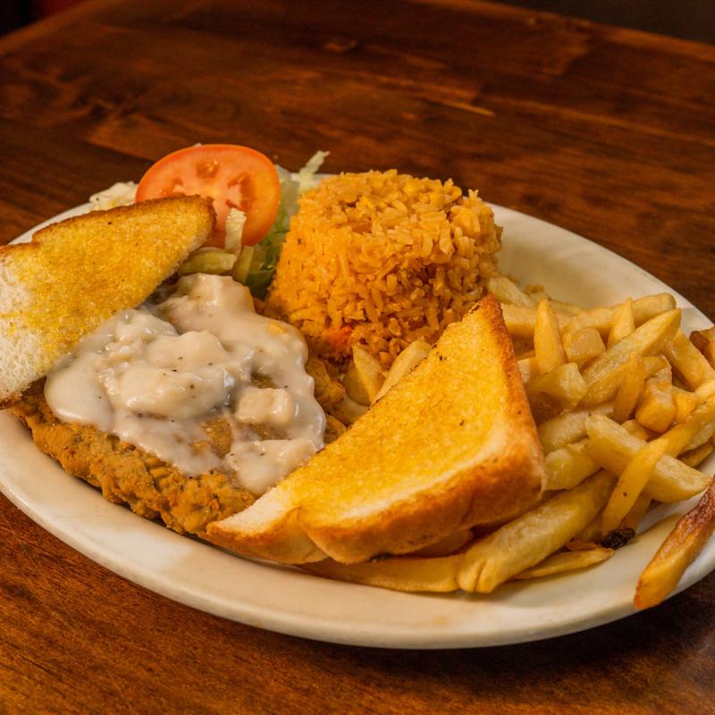 Homemade chicken-fried steak, served with white gravy, French fries, rice, salad, and toast.