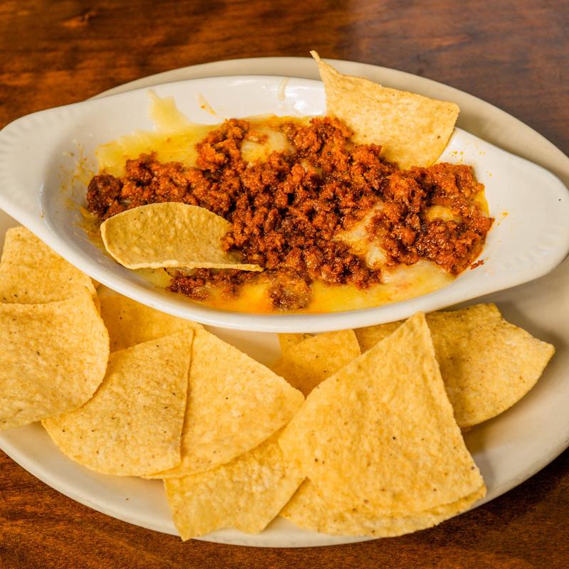 Beef fajita strips smothered with Monterrey Jack cheese and Mexican chorizo. Served with guacamole, pico de gallo, and charro beans.
