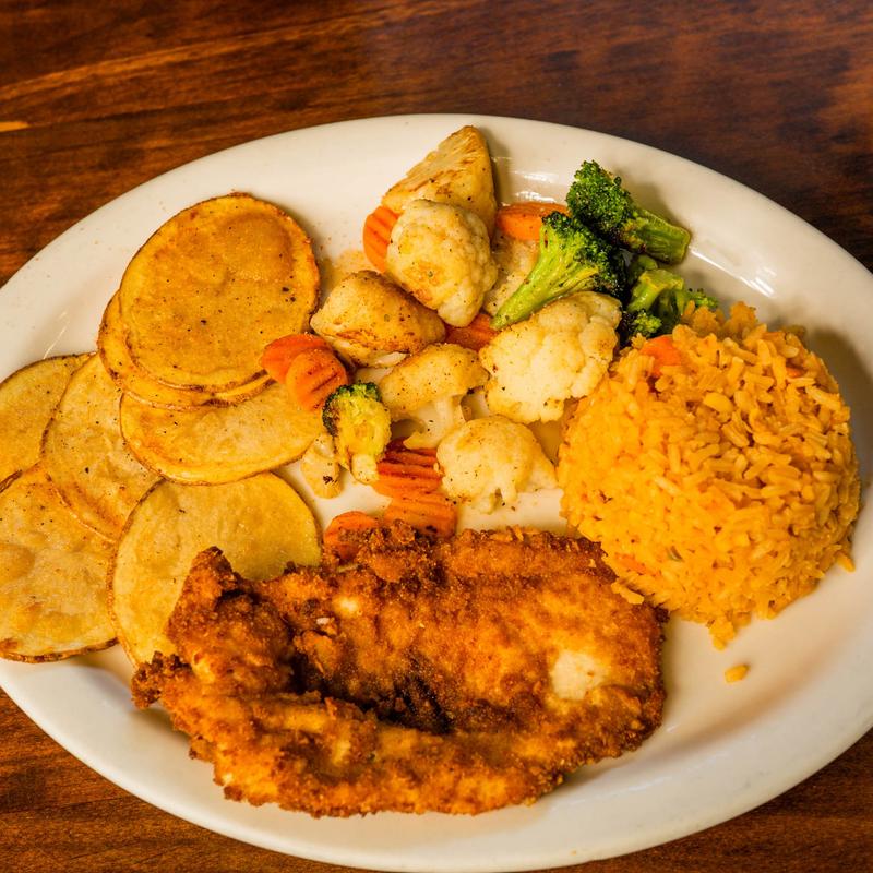 Breaded chicken or beef skirt with steamed vegetables, rice, avocado, and potatoes.